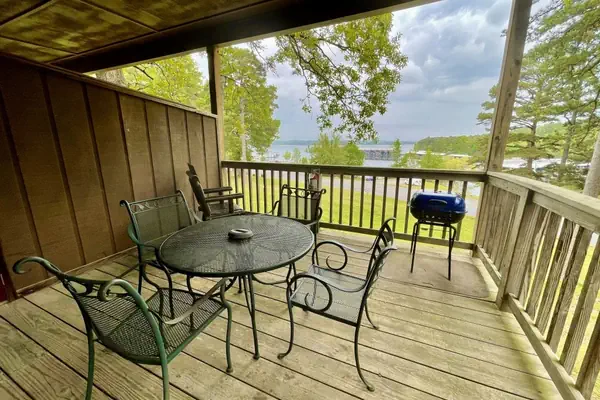 There are two chairs and one small end table on the lakeside patio.