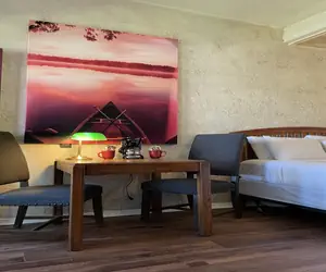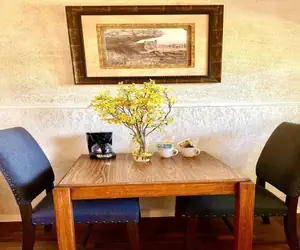 The living room has a sleeper sofa, cozy dining area, a TV, small microwave, personal sized refrigerator and a four cup coffee maker. Daily coffee, hot cocoa and popcorn provided in the unit.
