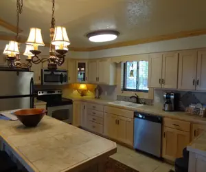 This unit has a king bed in the master and two queens in each guest bedroom, and three full baths. There is a fully equipped kitchen, washer and dryer, four TV's, and large deck with patio furniture and charcoal grill. The kitchen has dishware and cookware for 8. Free internet!