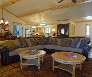 Our largest three bedroom, three bath Harbor North cottage, one of our signature premiere log sided cottages. Beautifully furnished in an eclectic blend of antiques and comfortable, contemporary pieces, our Harbor North cottages all feature beautiful tile floors in the bathrooms and hardwood floors in the great room. Enlarged floor plan in living area has almost 200 square feet more than our other cottages. This has the most beautiful lake view of all!