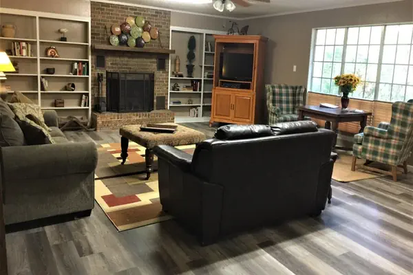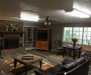 VanGuilder Lodge -- Mountain Harbor's newest lodging opportunity! Because we listened to what our customers are asking for -- affordable lodging with space for the whole family with the signature Harbor style! We've updated one of the original residences on the Harbor road with fresh new touches to give you the space you need at an exceptional price! This four bedroom, three bath home sits atop an acre and a half of forested landscape just 1.6 miles down the Harbor Road from our Lodge and features a covered outdoor dining area, an enclosed two car garage/patio with native stone floor, a fully equipped kitchen, covered deck off the dining area, washer and dryer, two TV's and a wood burning fireplace. There are two bedrooms with a king bed, one bedroom with a king and a queen and one bedroom with a queen. The spacious living area features a vintage red brick fireplace and there's more sleeping options with a queen sleeper sofa.