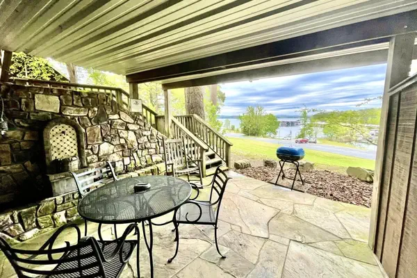 There are four chairs and patio table on the lakeside patio as well as a charcoal grill.
