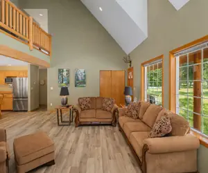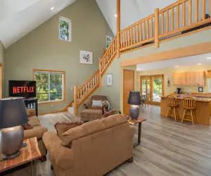 The great room welcomes you with cathedral ceilings, rustic knotty pine accents, and an open-concept layout perfect for relaxing or entertaining. Lounge on comfortable seating for six while enjoying the smart TV with streaming and DVD options. Upstairs, a lofted gathering area offers extra space for board games, reading, or quiet conversations.