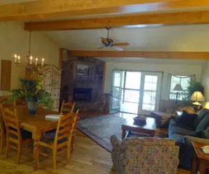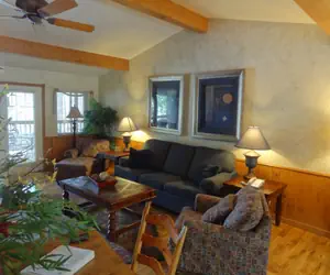 This is a two bedroom, two bath Harbor North cottage, one of our signature premiere log sided cottages. Beautifully furnished in an eclectic blend of antiques and comfortable, contemporary pieces, our Harbor North cottages all feature beautiful tile floors in the bathrooms and hardwood floors in the great room.
