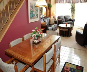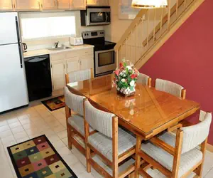 Stoneridge D43 has thirty-two steps leading in, is multi-level, offers internet access, includes a one-car garage, and is not pet friendly. This standard-rated unit sleeps eight. The living room features a flat-screen smart TV, and there is no fireplace available for use. The fully functional kitchen complements a dining room that seats six.