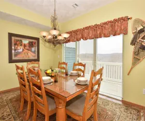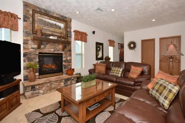 Thirteen steps up from the entry foyer, you'll find the living room equipped with a flat-screen TV and a gas fireplace. The fully functional kitchen includes a breakfast bar with three stools, while the dining room seats six. This level also features a queen bedroom with a flat-screen TV and a full bath.