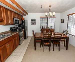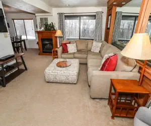 Stoneridge D31AB features 24 steps in, is one level, has internet access, and is not pet-friendly. This home has a standard rating and sleeps fourteen. Upon entering the connecting foyer, you'll find the living room with a flat-screen TV and a gas fireplace. There's a fully functional kitchen, and the dining room seats six. The first bedroom offers a queen bed, a flat-screen TV, and a full bath. The second bedroom has two double-size bunk beds with a pull-out trundle and a TV. The third bedroom offers a queen bed and a TV, and these rooms share the second full bath.
