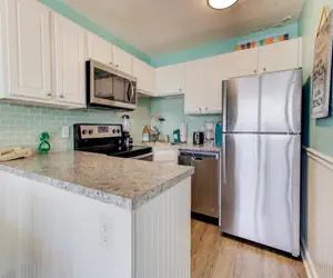 The living and dining area is bright and open, with large windows inviting natural light and offering glimpses of the shoreline just beyond. The full kitchen is equipped with full‑size appliances, cookware, and dishware—making it easy to enjoy breakfasts before beach walks, snack breaks after sand time, or a relaxed dinner in.