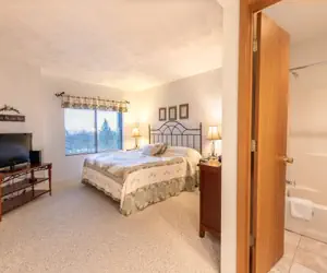 The master bedroom offers a king bed, a TV, and a full bath. The second bedroom has a double bed, a single bed, a TV, and the second full bath.