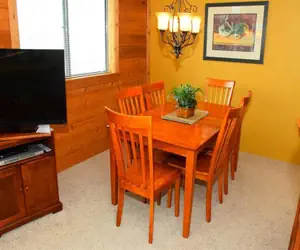 Sunridge X8 has thirteen steps in, is multi-level, offers internet access, and is not pet-friendly. This unit is rated deluxe and sleeps nine. In the main living area, you'll find the living room with a flat-screen TV and a queen sleep sofa. The wood-burning fireplace is not available for guest use. There is a fully functional kitchen with a breakfast bar that seats two, and the dining table accommodates six.