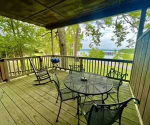 There are four chairs and patio table on the lakeside patio as well as a charcoal grill.
