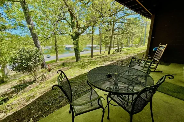 There are four chairs and patio table on the lakeside patio as well as a charcoal grill.