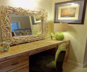 The bedroom area has two queen beds, dressing table and flat screen TV and the full size bath has a shower/tub combo.