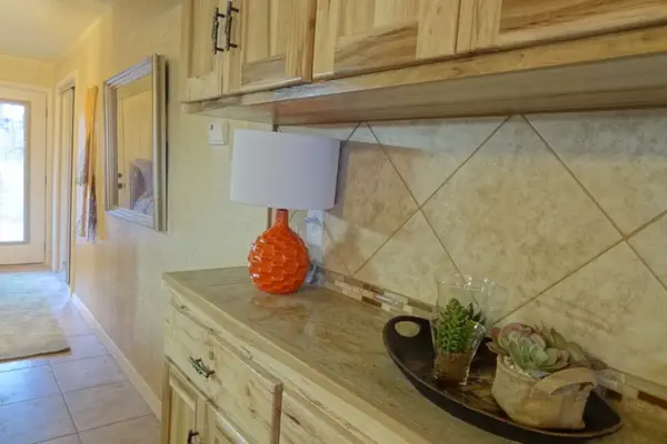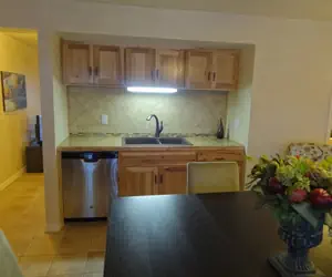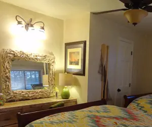 Our beautifully remodeled Lodge Cabana has one spacious room divided by a kitchen area with full stainless size range, refrigerator, dishwasher and microwave, new hickory cabinetry and granite tile countertops. Dishware and cookware for six provided. The cabana opens out onto our lodge pool area and is directly under our restaurant, so be aware of high traffic area.