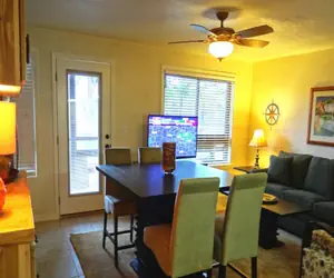 The living room has a sleeper sofa, cozy dining area and flatscreen TV with DVD player.