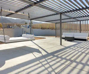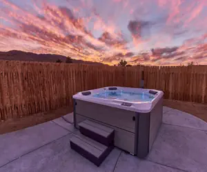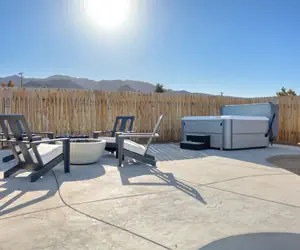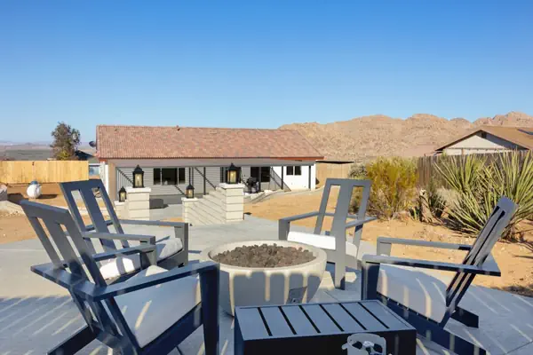 Outdoors, you'll be treated to desert sky views and multiple relaxation areas, including a large patio and contemporary pergola with a BBQ grill and high-end luxury outdoor seating. The private backyard features a propane fire pit with four chairs, a six-seater spa with jets, and a large bed swing under the pergola.