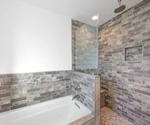 Indoors, you'll find a luxurious master bedroom with a king bed made of refurbished wood, dressed in white linen sheets, and an ensuite bathroom with a large tub and walk-in shower. The bedroom also features a spaciously crafted walk-in closet and white granite tops. Two more spacious bedrooms with queen-sized refurbished wooden beds, white linen sheets, and plush white robes complete the indoor sleeping arrangements.