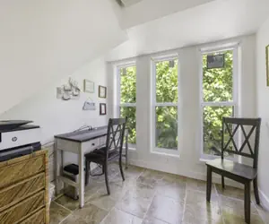 • A corner of the living room has been set up as a nice little office, with a writing desk, phone, and chairs.