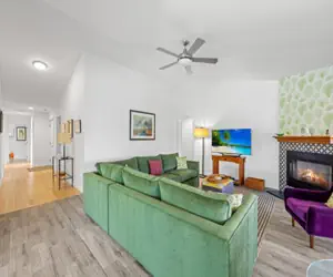 The open floor plan invites you to sit back and relax in the large living room with a large flat-screen TV with streaming video, a dining room, and a fully equipped kitchen with stainless steel appliances.