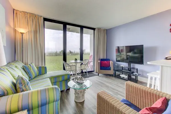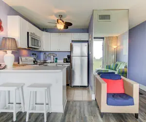 The open-concept living space is perfect for relaxing after a day at the beach, with large windows that fill the condo with natural light and offer beautiful coastal views. The fully equipped kitchen makes meal prep easy, whether you’re enjoying breakfast before heading out or winding down with a home-cooked dinner.