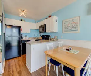 The open-concept living space is perfect for relaxing after a day at the beach, with large windows that fill the condo with natural light and offer beautiful coastal views. The fully equipped kitchen makes meal prep easy, whether you’re enjoying breakfast before heading out or winding down with a home-cooked dinner.