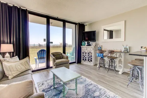 The bright, open living space invites you to unwind with expansive windows that bathe the room in natural light and frame the turquoise waves just beyond. The fully equipped kitchen includes full-size appliances, cookware and dishes—making it easy to enjoy casual breakfasts, lunch after the beach, or a relaxing dinner in.