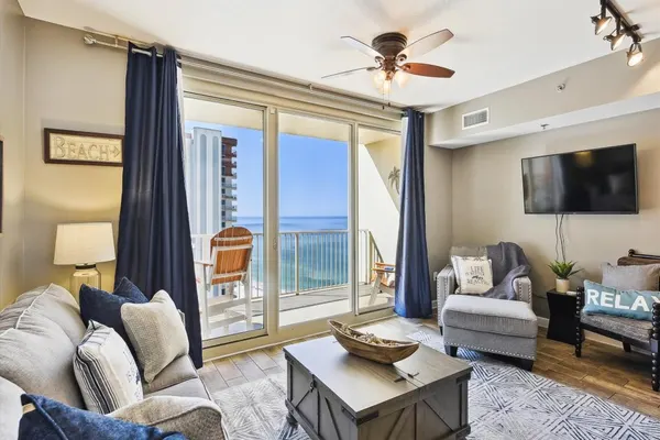 The Shores of Panama 1708 rental condo features gray and cream furniture that brings out calming and good vibes. We follow the nautical theme so you can really feel like you are living right on the water!
