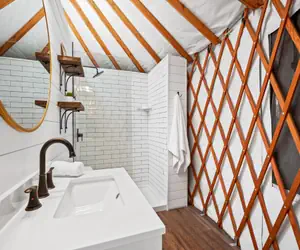 • A clear dome located directly over the bed allows natural light to stream in during the day and a glimpse of the stars and moon at night before you drift off to sleep. Rainy nights in a yurt are unlike any other!