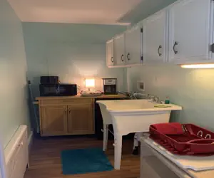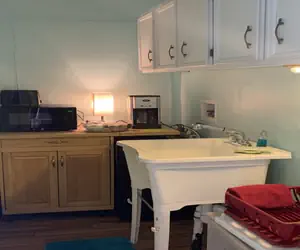 • The kitchenette includes a small refrigerator, microwave, coffee maker, and toaster.