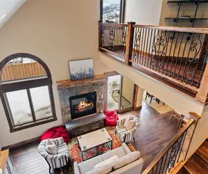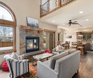 Upon entering the home, you will immediately find the common areas connecting the living room, kitchen, and dining room. Guests will love the high ceilings that give a luxury feel to the home. The grand fireplace is the focal point of the living room and is the perfect spot to gather around for movies or games after a busy day in Steamboat Springs. This property boasts a high end projector (instead of a tv) so you can fill the entire wall with whatever you desire to watch (sports, movies, tv shows) and feel like you are in your own home theater!