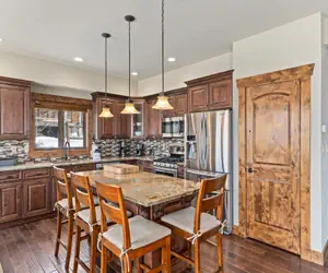 The well-appointed kitchen is a home chef's dream with gorgeous finishes and a large kitchen island. The kitchen is well stocked with all of the pots, pans, and utensils you need to create a delicious meal for your group. Watch the snow fall through the large windows surrounding the dining area. The dining room table can fit 8, with an additional 4 at the kitchen bar.