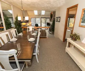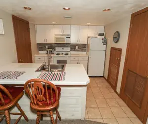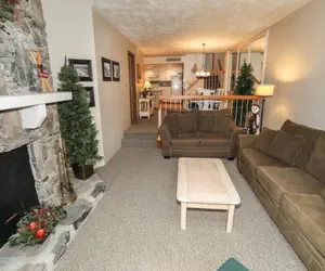 Meadowridge 8022 has three steps in, is multi-level, offers internet access, and is not pet-friendly. This unit is rated deluxe and sleeps four. Eight steps down from the entry foyer, you'll find the living room featuring a flat-screen TV. Important: the wood-burning fireplace is not available for use. The fully functional kitchen includes a breakfast bar with two stools, and the dining table seats six.