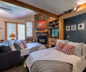 Unwind in our charmingly rustic yet elegant condo, perfect for a tranquil getaway. This one bedroom retreat accommodates up to 6 guests comfortably. You'll find a separate main bedroom, a fully equipped kitchen, a spacious bathroom, and a cozy gas fireplace. Step out onto the mountain-facing deck and be mesmerized by breathtaking views. The living and dining area provide ample space to relax and socialize. Nestled gracefully at the alpine base, our condo offers unrivaled convenience with ski-in/ski-out access just a few steps away. Embrace the beauty of the mountains and indulge in a memorable stay.