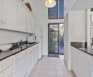 Looking for some quiet time, a small outdoor atrium is situated between the kitchen and second bedroom. The bistro table and chairs make for the perfect spot to enjoy your morning coffee. Need to check email before a day of leisure, there is a small nook with a desk and chair that looks out into the atrium.