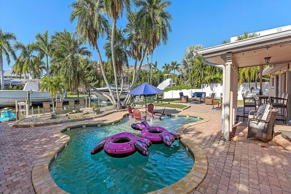 As you continue into the heart of the home you will find the formal dining room with a large, ornate wooden table with seating for 8, and buffet table to place all the delicious foods you will prepare in the gourmet kitchen. Just a few steps away is the inviting living room with over-stuffed couches, ottoman, chaise lounge and large flat-screen TV. Watch out for the octopus! French doors and large windows offer up amazing views of the pool and canal, as well as access to the backyard oasis.