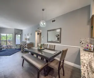 Beautiful remodeled 2/1 condo at Inverness Condominiums that overlooks the Comal River in New Braunfels, Texas. Covered parking, elevator and it is on the top floor so you will not hear anyone above you. It has a stackable washer and dryer, fully equipped kitchen, pots, pans, linens and everything you need for a family getaway or romantic weekend. The complex has a swimming pool, direct river access, dedicated parking and outdoor grills. There is a large wooden deck that overlooks the grounds and many tables for socializing.