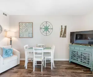 The entry to this 1 bedroom/1.5 bath suite opens into a large, newly furnished living room combined with an open dining area and kitchen including stainless steel appliances. Courtesy soap and shampoo as well as a starter roll of TP are left in the bathroom, plus 2 garbage bags, dish soap, and a dishcloth in the kitchen. There is a Smart TV plus cable in the living room giving you plenty of options to enjoy a movie after a long day in the sun.