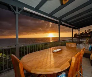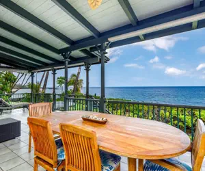 Inside Hoku'Ea Hale, you'll find high open beam ceilings and plenty of comfortable seating in the living room, which makes the perfect place to put your feet up and take in the beauty of the Pacific. The newly remodeled kitchen features ocean views from every angle. Fully stocked with all of the culinary essentials, this space features a large island with additional seating for your guests, allowing you to converse with friends and family while preparing a delicious meal. Enjoy the upgraded finishes of the first-floor bathroom which is conveniently situated near the kitchen and living areas. A bonus room near the kitchen features lanai and ocean views and is equipped with a large, flat-screen TV and high-speed internet connection. This space has a sleeper sofa as well as additional seating, perfect for accommodating additional guests. The lanai is furnished with a large dining room table and features unbelievable views.