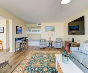 The master suite features a king‑size bed, its own private bathroom. The second bedroom is equally inviting with a king‑size bed, ideal for a second couple or guests who value space and comfort. The living room includes 2-sleeper sofas, providing flexible space for additional guests without compromising on the comfort of the living area, along with bunk beds for kids or teens.
