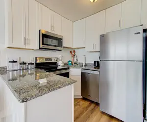 The living area opens into a bright and inviting space where you can relax, read, or simply take in the coastal atmosphere. A fully equipped kitchen with full‑size appliances, cookware and dishes makes it easy to enjoy breakfast before heading out, lunch after the beach, or a relaxed dinner at home.