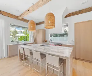This residence welcomes you with tall ceilings and an open concept first floor. Modern art and photography is found throughout the home, accompanied with dark muted pastels. The living room, dining and kitchen flow so effortlessly with an ample amount of space. The kitchen proudly features top of the line stainless steel appliances, a large center island, and bar stool seating for 4 guests. The stylish dining table offers seating for 8 guests. The backyard of the home features an appealingly abundant private pool (that can be heated for $50/day), an outdoor dining table, and a grill. There is an elevator in this home and half bathroom on this floor.