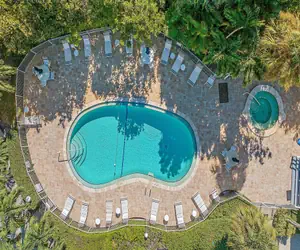 Just steps away from your door, you'll find the pristine heated pool and inviting hot tub. Ample sun loungers, umbrellas, and tables invite you to unwind and bask in the warm Florida sun.