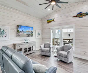 There is a large patio out the side door and a small grassy area in the back of the house. There is a one car garage to put your beach and fishing gear.