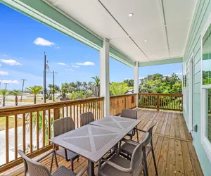 Upstairs are the Views, Views, Views! The open living room/ kitchen/ dining area has plenty room for everyone to spread out and enjoy themselves. The large balcony off the living area has a nice table and chairs to sit and watch the water with a coffee or a cocktail.