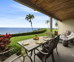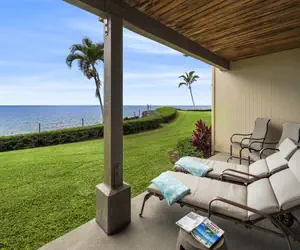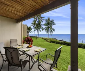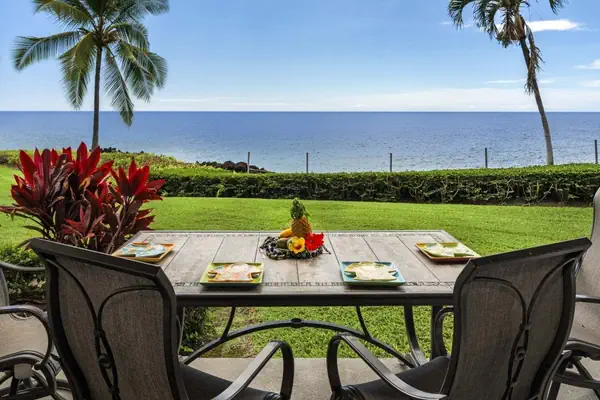 A very spacious Lanai that allows you to walk out and enjoy the jaw-dropping coastline ocean views. You have outdoor dining and chaise lounge chairs for relaxation!