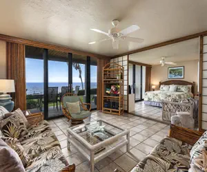 The Front Ocean Facing Bedroom has Direct Oceanfront Lanai access & a comfortable King Sized Bed.