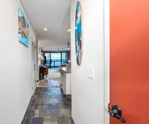 The primary bedroom has a king bed with private lanai access and an ensuite bathroom. Enjoy laying in bed and looking at the ocean, or coffee in bed while enjoying the blue seas. The bathroom has a shower washer and dryer for guests' use.