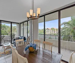 Step through the sliding glass doors onto the wrap-around balcony, where sun loungers and an outdoor dining table and chairs await. This is your private oasis to savor the warm Gulf breeze, dine al fresco, or simply bask in the Florida sunshine. The balcony offers stunning views of the pool, creating a serene backdrop for your moments of relaxation.