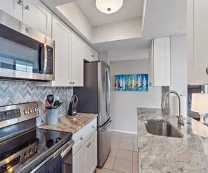Adjacent to the living area is a beautiful wooden dining room table that comfortably seats six. It's the perfect spot to gather for meals, playing board games, or planning your next day's adventure. The galley kitchen, a culinary enthusiast's delight, boasts granite counters, stainless steel appliances, and pristine white cabinetry. Fully stocked with everything you need, from cookware to utensils, it invites you to showcase your culinary skills or simply whip up a quick snack before heading out to explore.