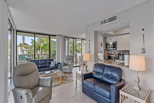 As you step into the condo, you'll be greeted by a seamlessly open living space that exudes modern elegance. The floor-to-ceiling sliding glass doors not only flood the space with natural light but also unveil breathtaking views of the pool and tennis courts. The living room is a haven of comfort, featuring a plush leather pullout couch, a flat-screen TV, a love seat, and two recliners. Whether you're enjoying a movie night or simply unwinding after a day at the beach, this space caters to all your relaxation needs.